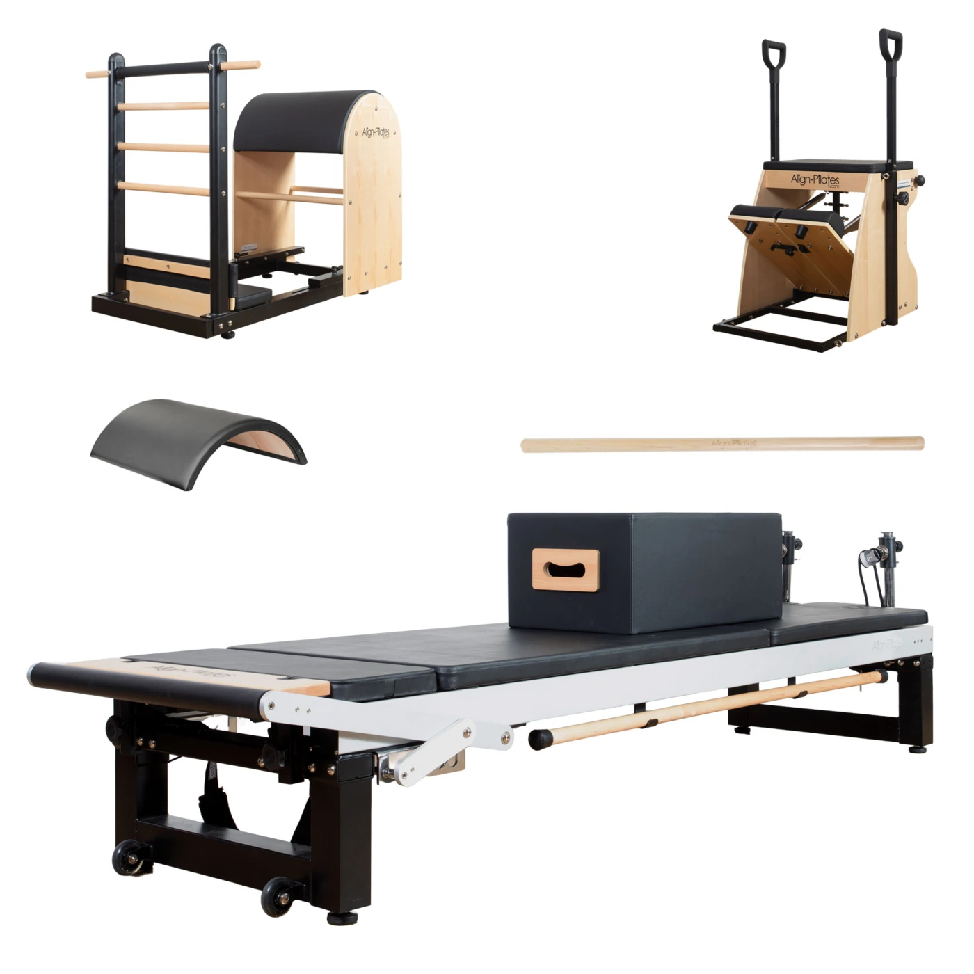The Align-Pilates One-To-One Pilates Studio Bundle provides a complete equipment solution for personalized instruction. The package features the premium A8-Pro Pilates Reformer, which can be converted into a matwork station using the included Mat Converter and Platform Extender.